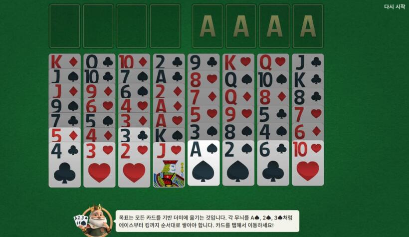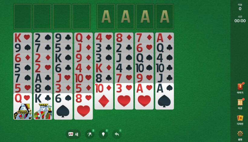 다른 솔리테어 게임과 달리 카드는 완전히 공개된 상태에서 시작되므로, 전체 배치를 분석할 수 있다는 점이 전략의 포인트가 되는데요.