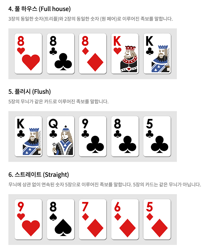 더 놀라운 변화는 플러시와 풀하우스의 순위입니다. 41장 덱에서는 플러시가 풀하우스보다 만들기 어렵기 때문에 플러시가 더 높은 족보로 인정받습니다.텍사스 홀덤에 익숙한 플레이어라면 각별히 주의할 필요가 있습니다.