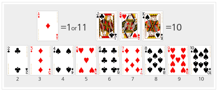블랙잭에서 카드 점수는 직관적으로 설계되어 있습니다. 숫자 카드인 2부터 9까지는 표시된 숫자 그대로 계산되죠. 10, J, Q, K는 모두 동일하게 10점으로 취급됩니다.