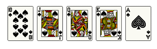 같은 무늬의 A, K, Q, J, 10으로 구성되며 약 649,740분의 1 확률로 등장합니다.