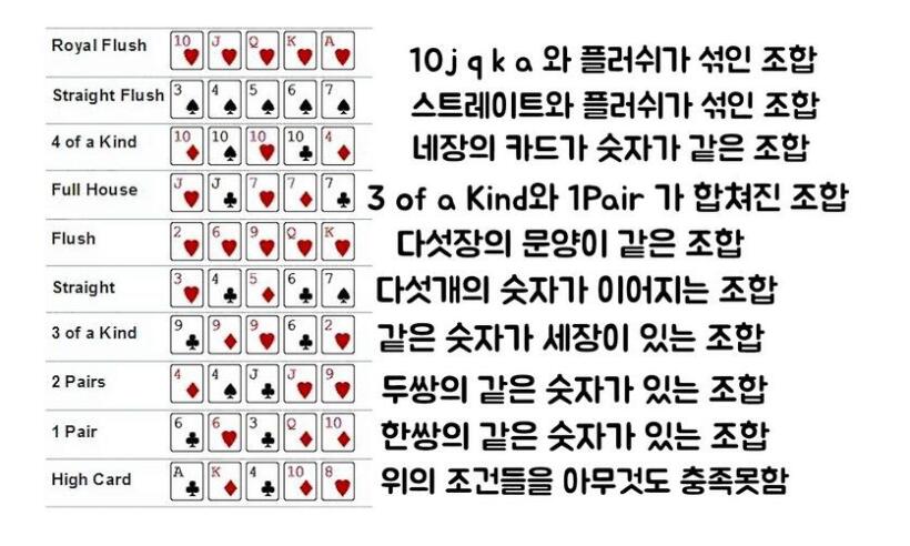 포커 실력을 키우려면 기본적으로 족보 암기를 해야 합니다.