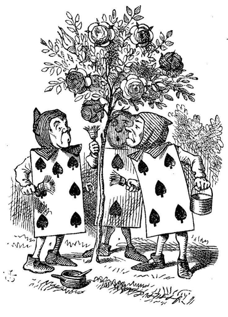 하얀 장미를 붉게 칠하는 장면을 위선을 상징하며 존 테니얼은 병사들의 어색한 자세와 떨리는 손을 표현해 우스꽝스러움을 드러냈습니다.