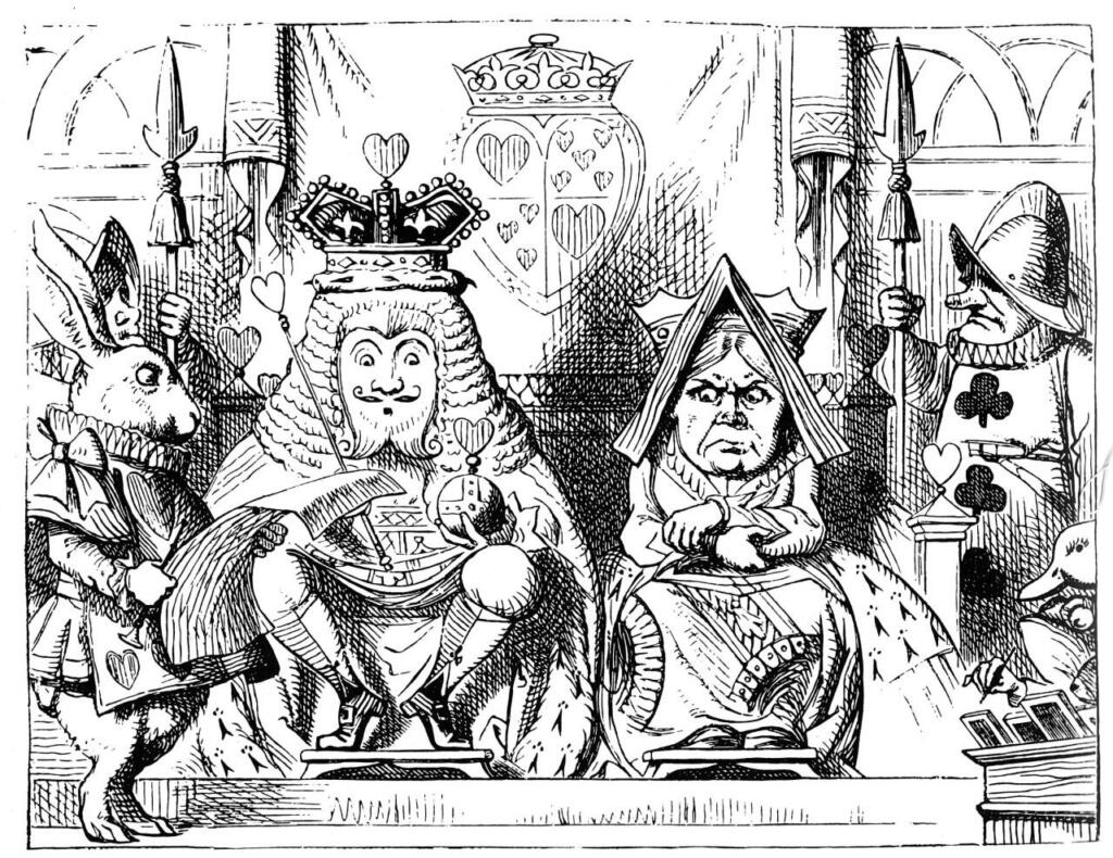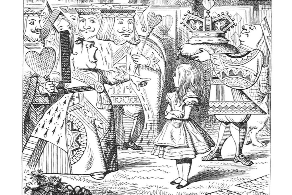 이상한 나라의 앨리스에서 트럼프 카드 일러스트는 당시 자의적 권력/권위주의의 부조리를 시각화하여 보여줍니다.
